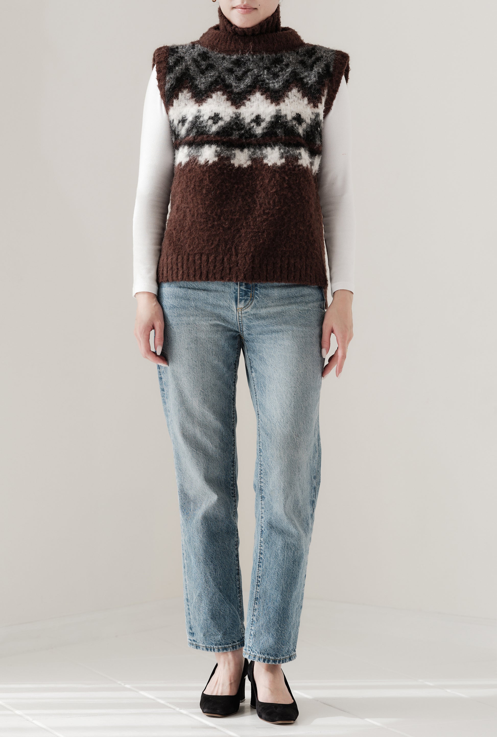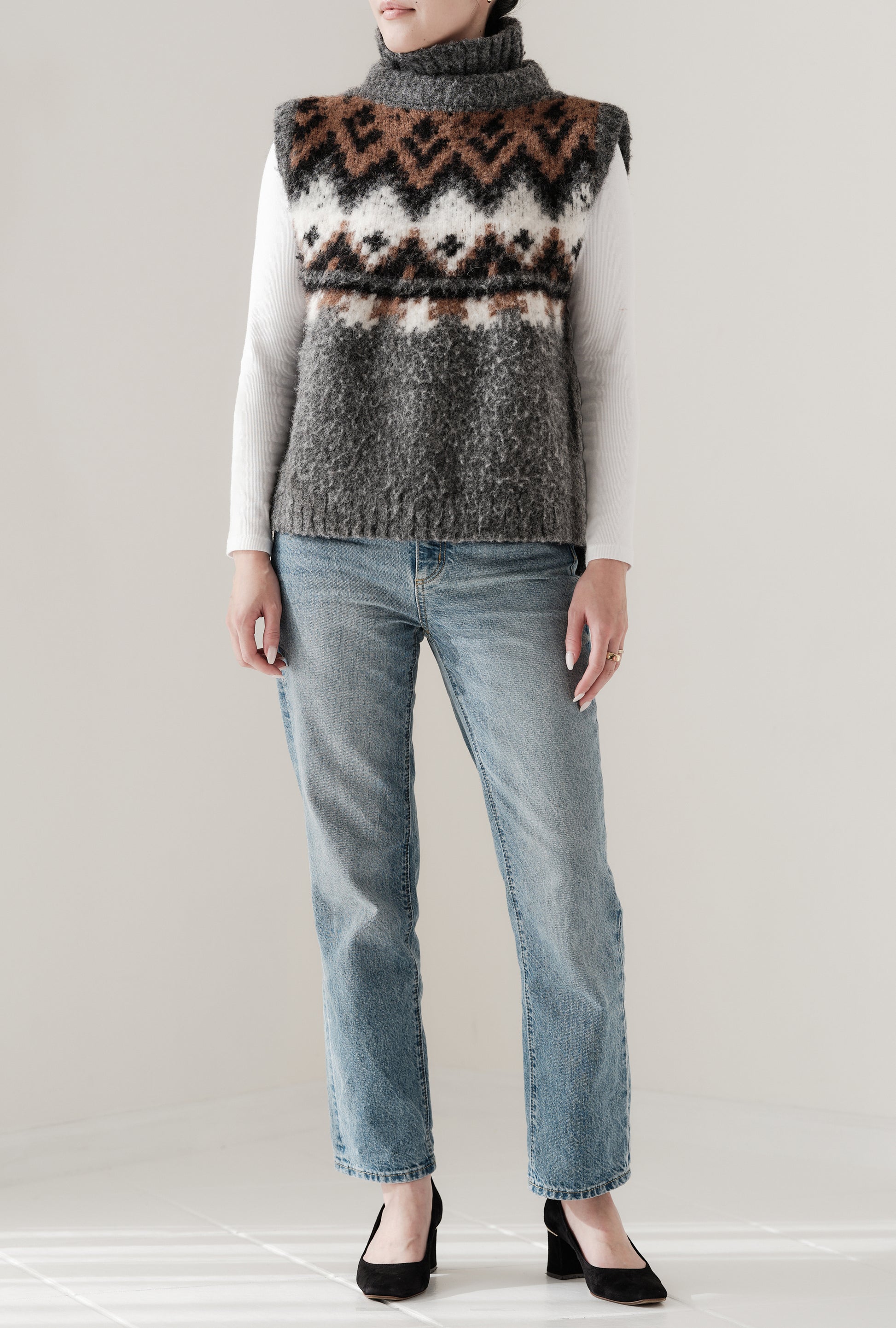 Irish goddess Ehloo, inspired by Fair Isle, a traditional graphic on Fair Island. aLORSOriginal Fair Isle knit vest. This is a time-consuming manufacturing method, where each product is brushed using thistle fruit.