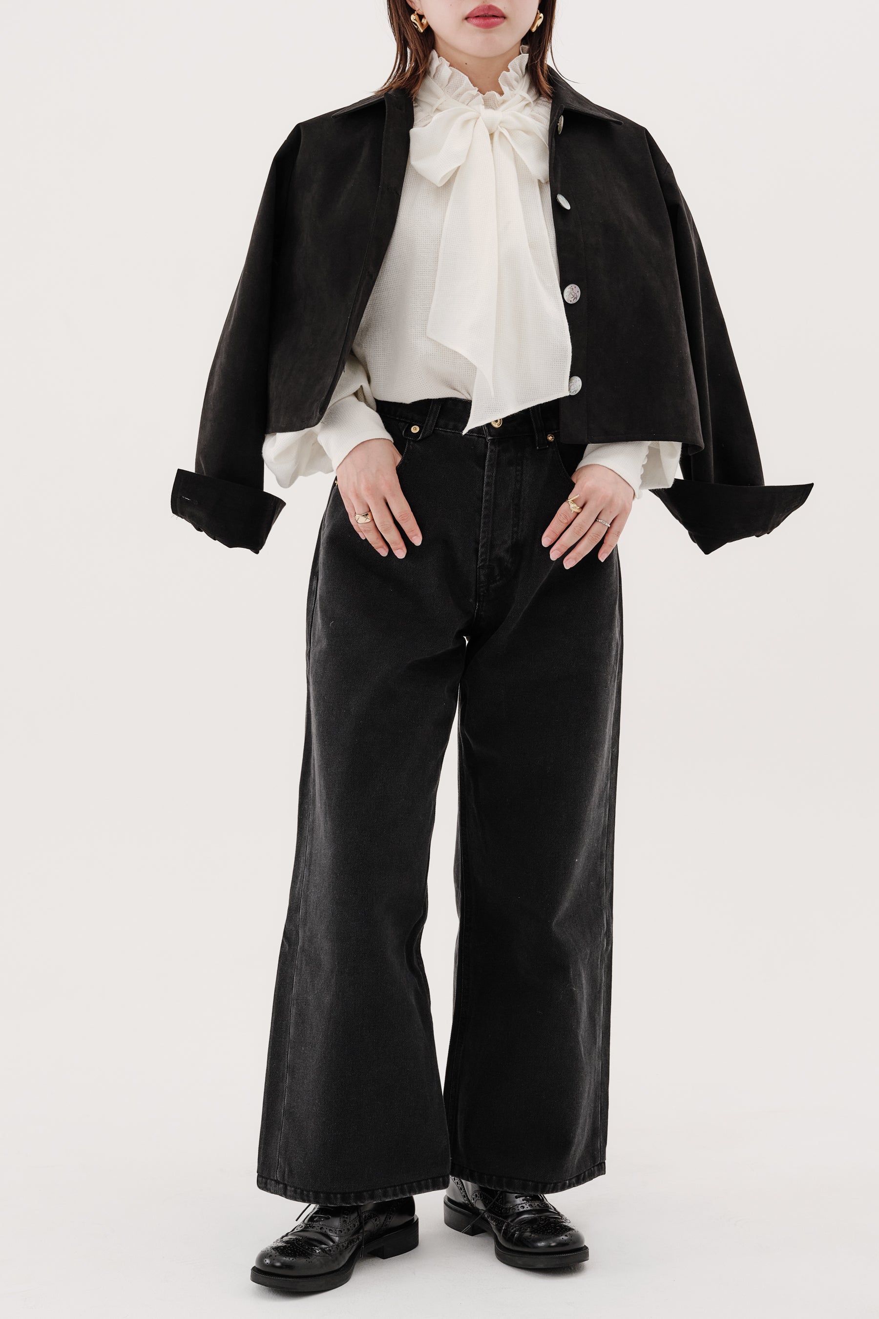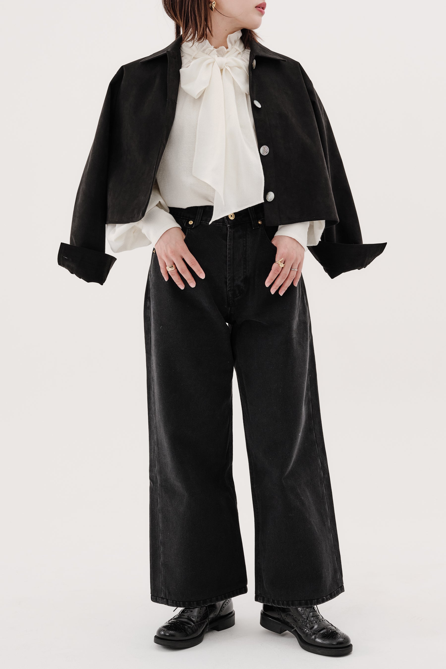 ふんわりとしたフェミニンなシルエットに、襟のフリルやカフスのくるみボタンがアクセント。