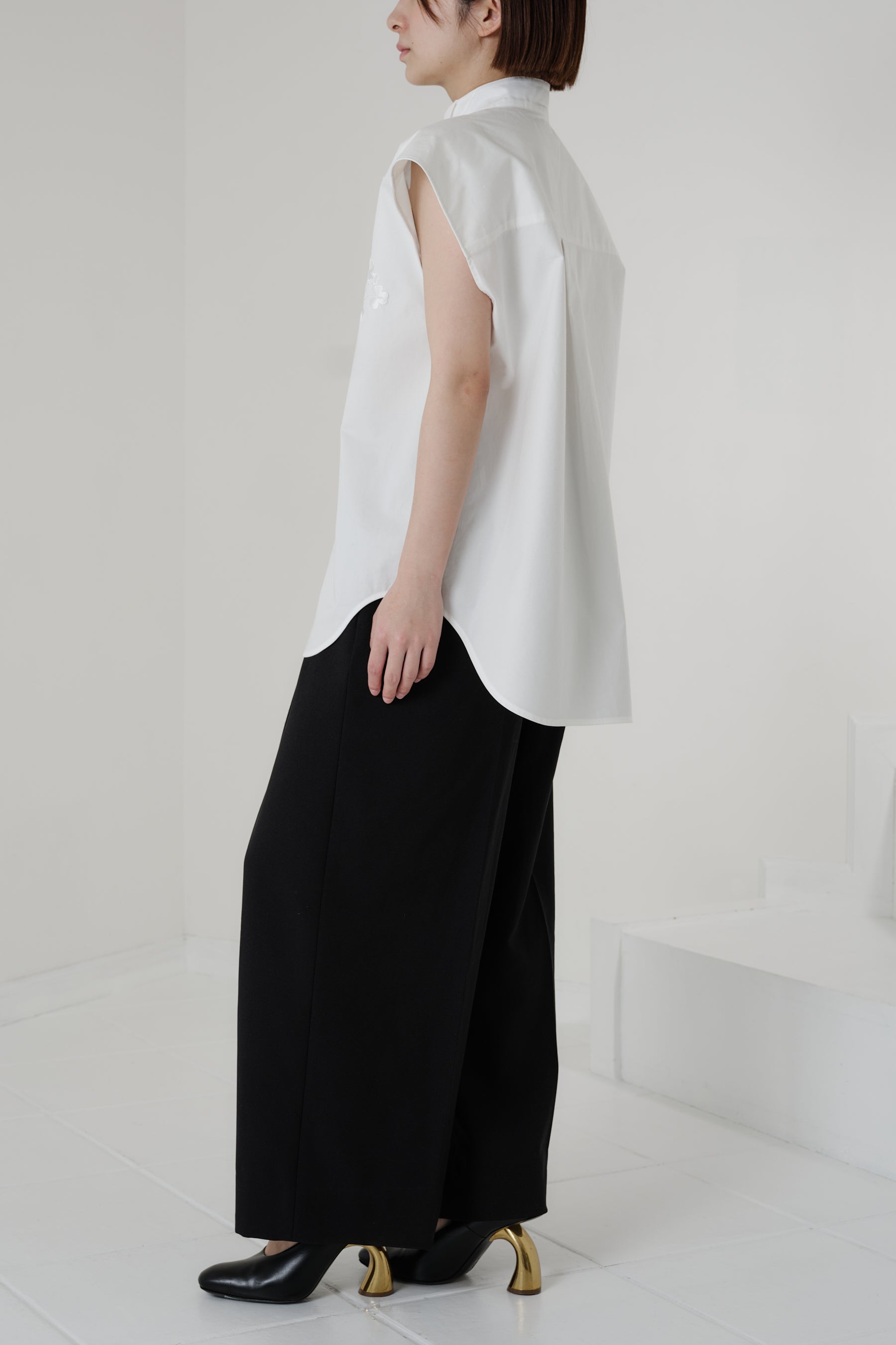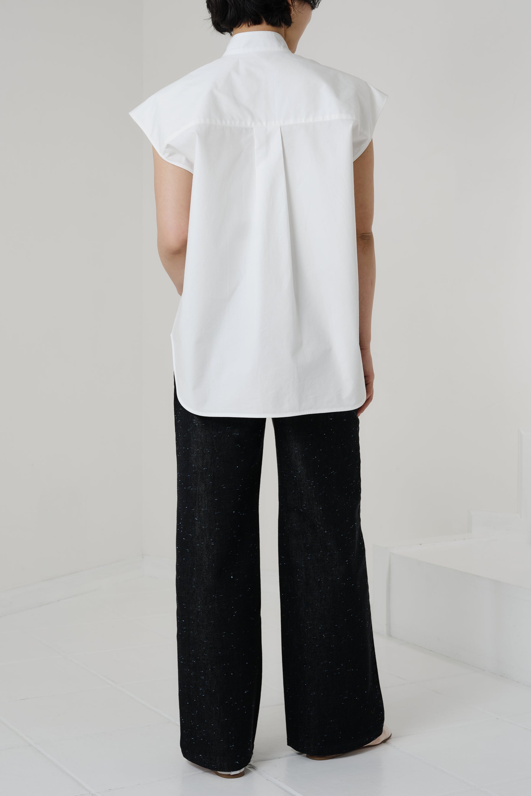 構築的なショルダーラインもこのシャツの特徴のひとつ。取り外し可能なショルダーパッドにより、シルエットの変化もお楽しみいただけます。