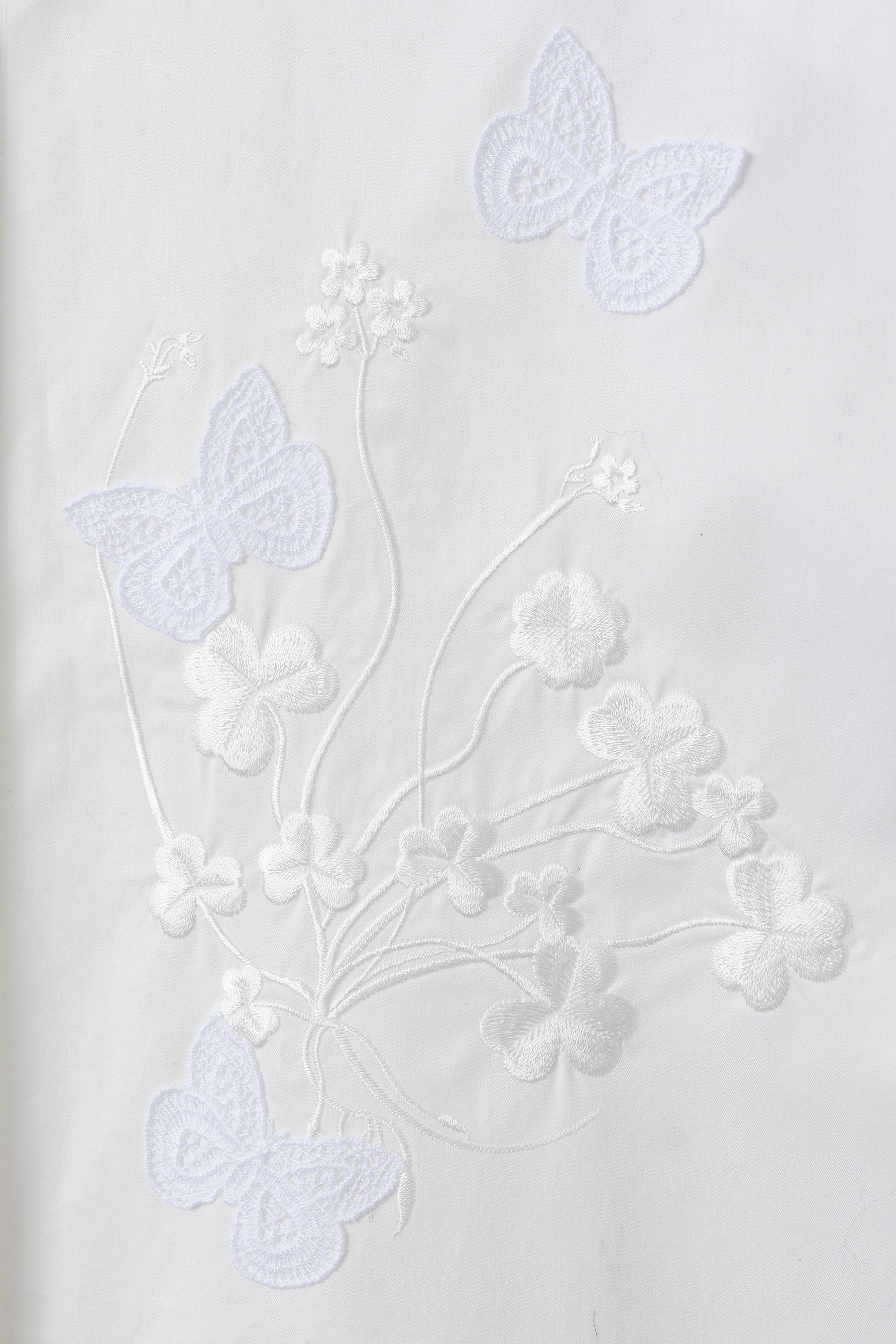 胸元には、三位一体の象徴とされるシャムロック(クローバー)の刺繍をあしらい、その上からイタリアで製作された繊細な蝶のマクラメパーツを重ねることで、奥行きのある立体感を表現しました。