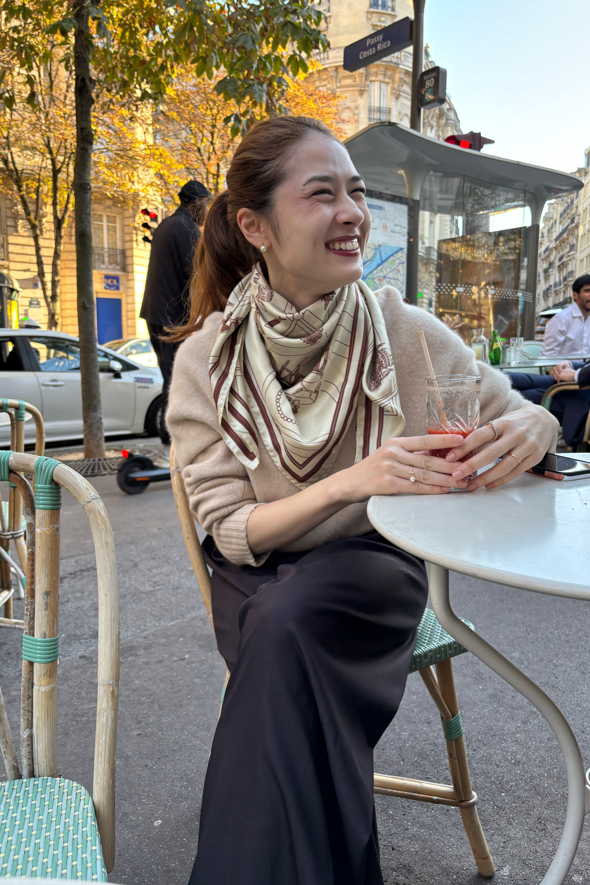 前回モデルから、シルク100%の生地へアップデートし、サイズも90×90cmにリニューアル。通年でご愛用いただける仕様になりました。