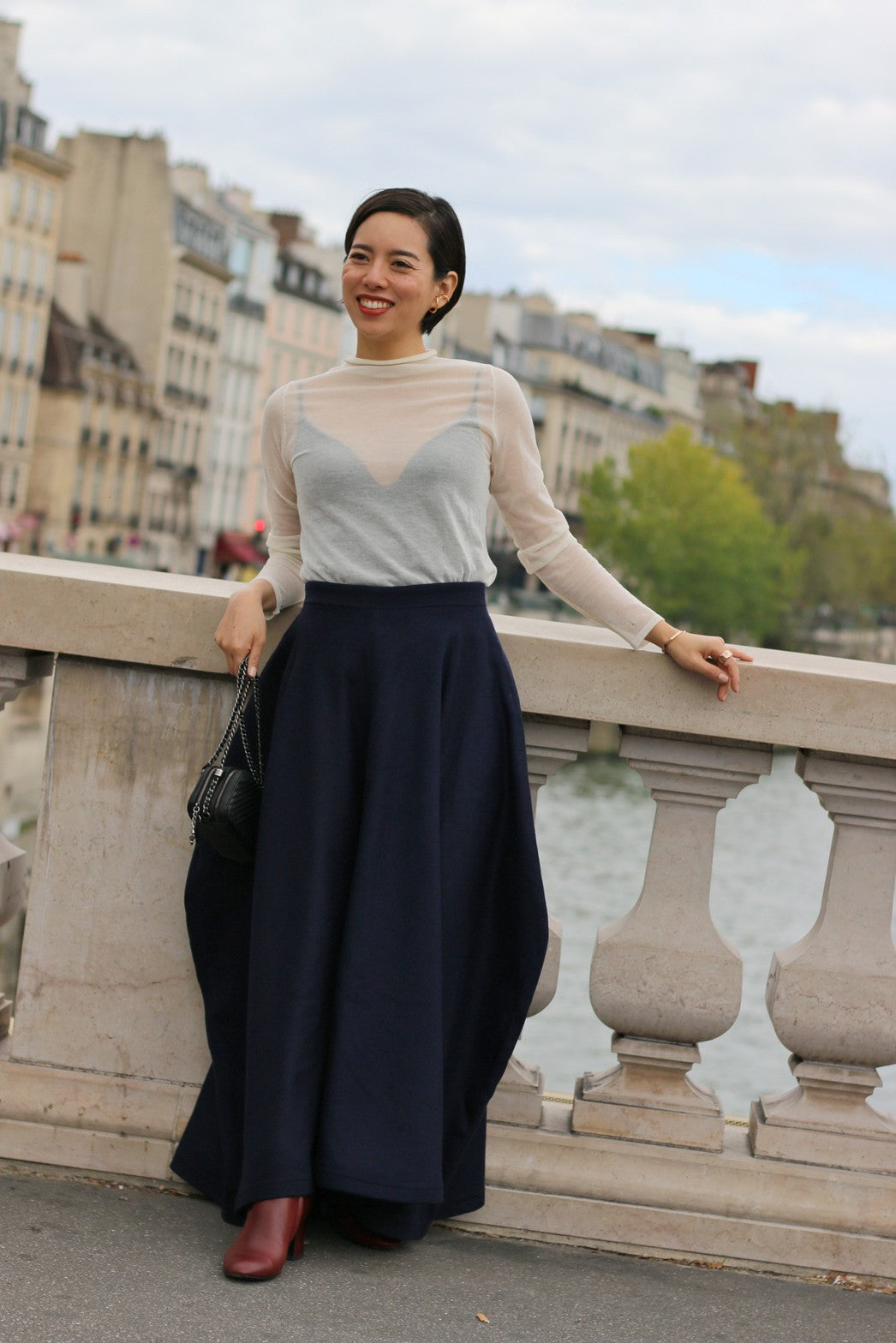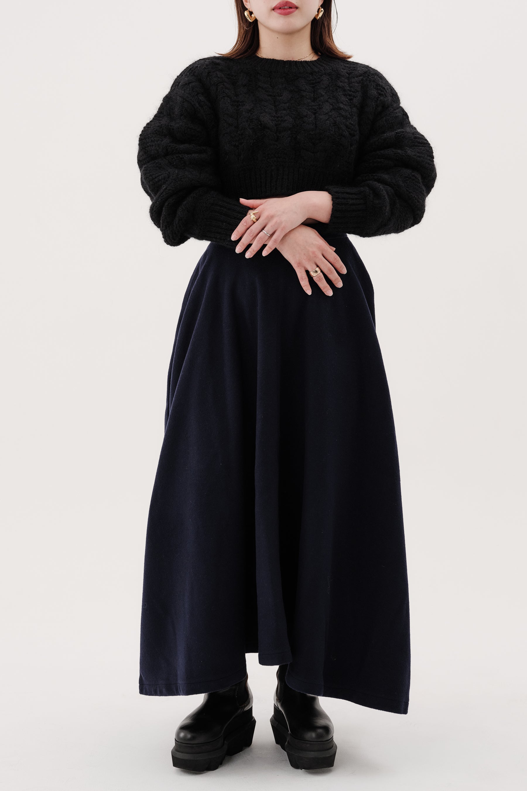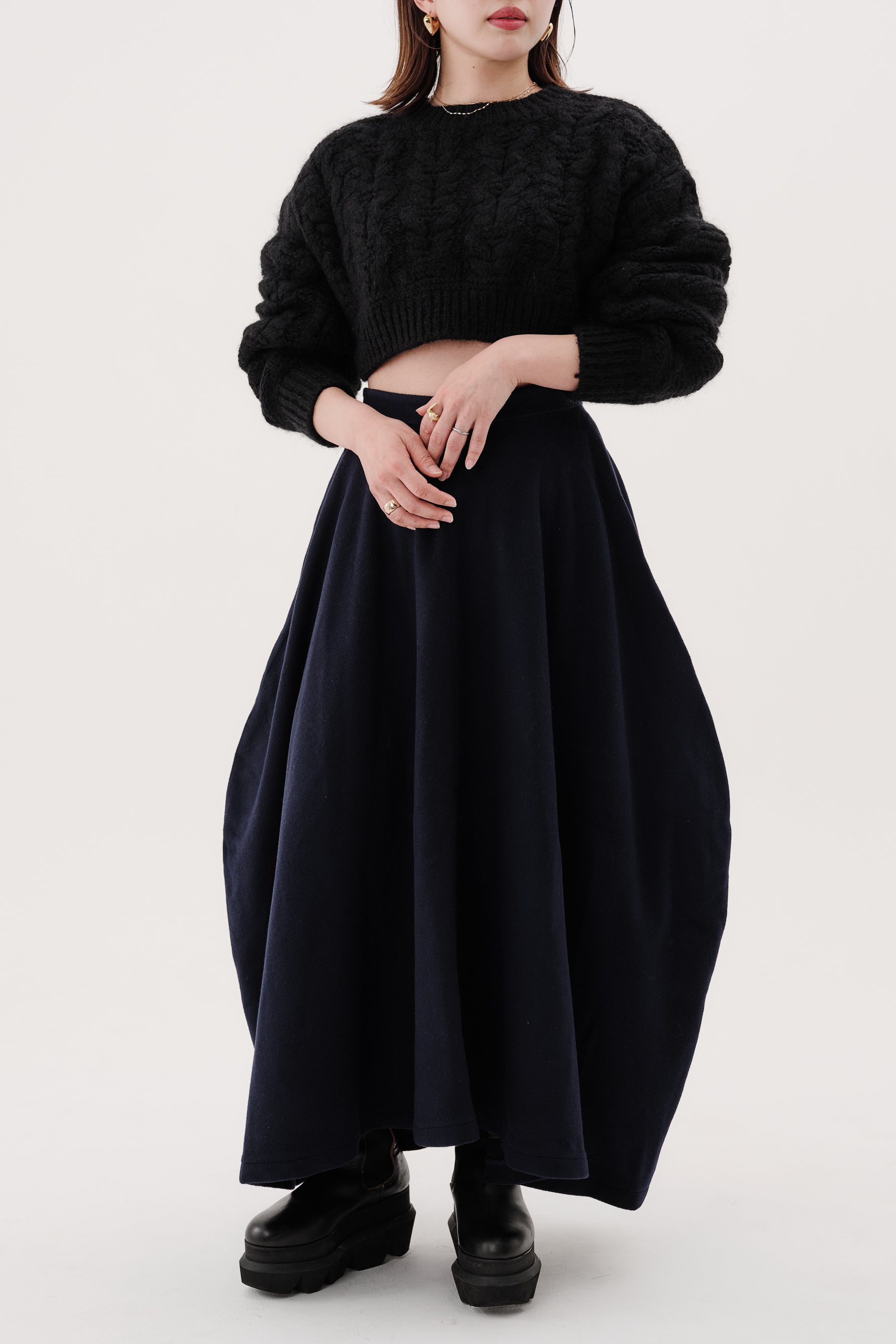 ブルゾンGabiと同じなめらかな光沢のあるウール生地を使用して立体的なシルエットをより可視化させたスカートを作成。