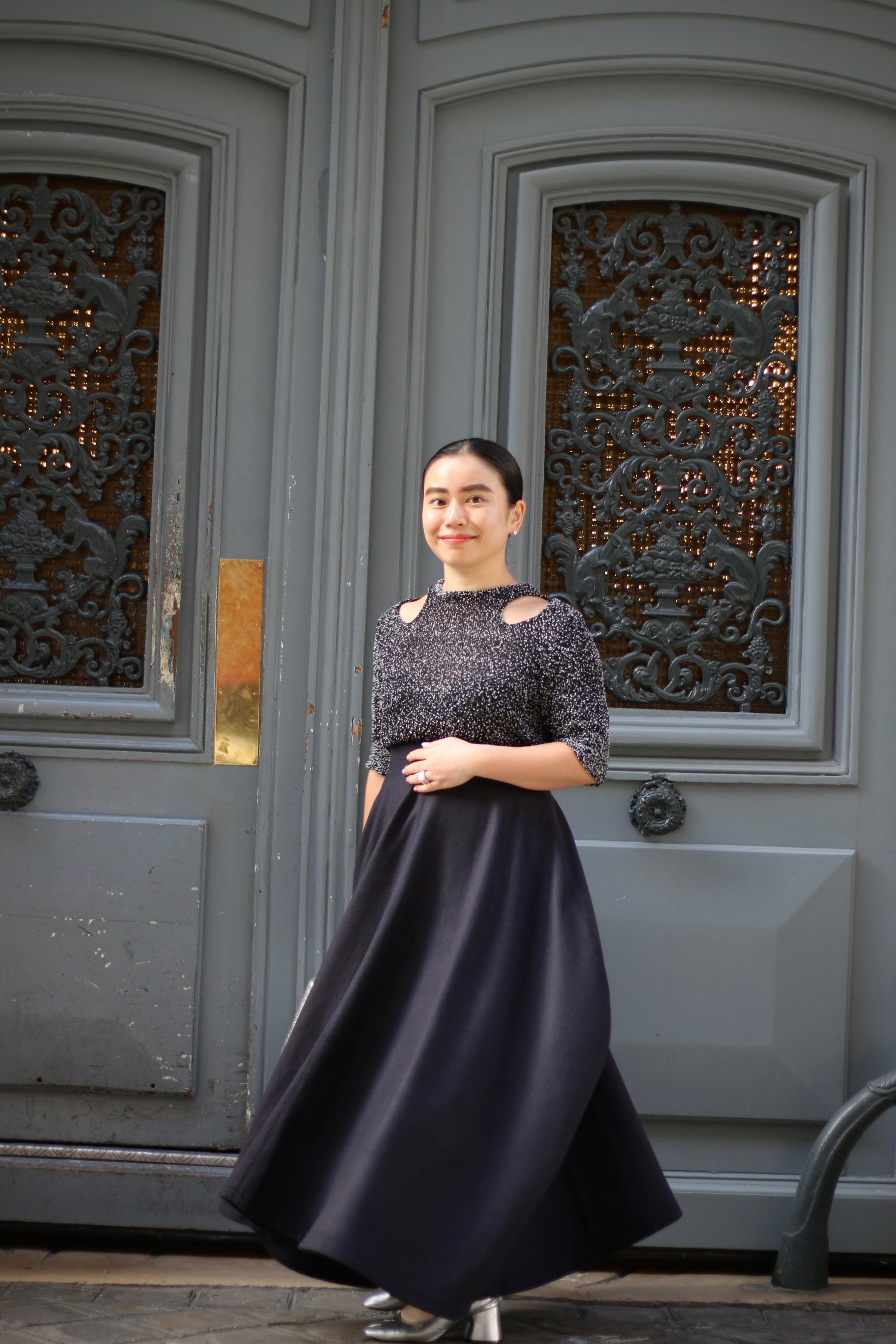 静止状態ではコクーン型、歩行時はなめらかなドレープで動きのあるAラインスカートになるよう細かく計算し構築いたしました。