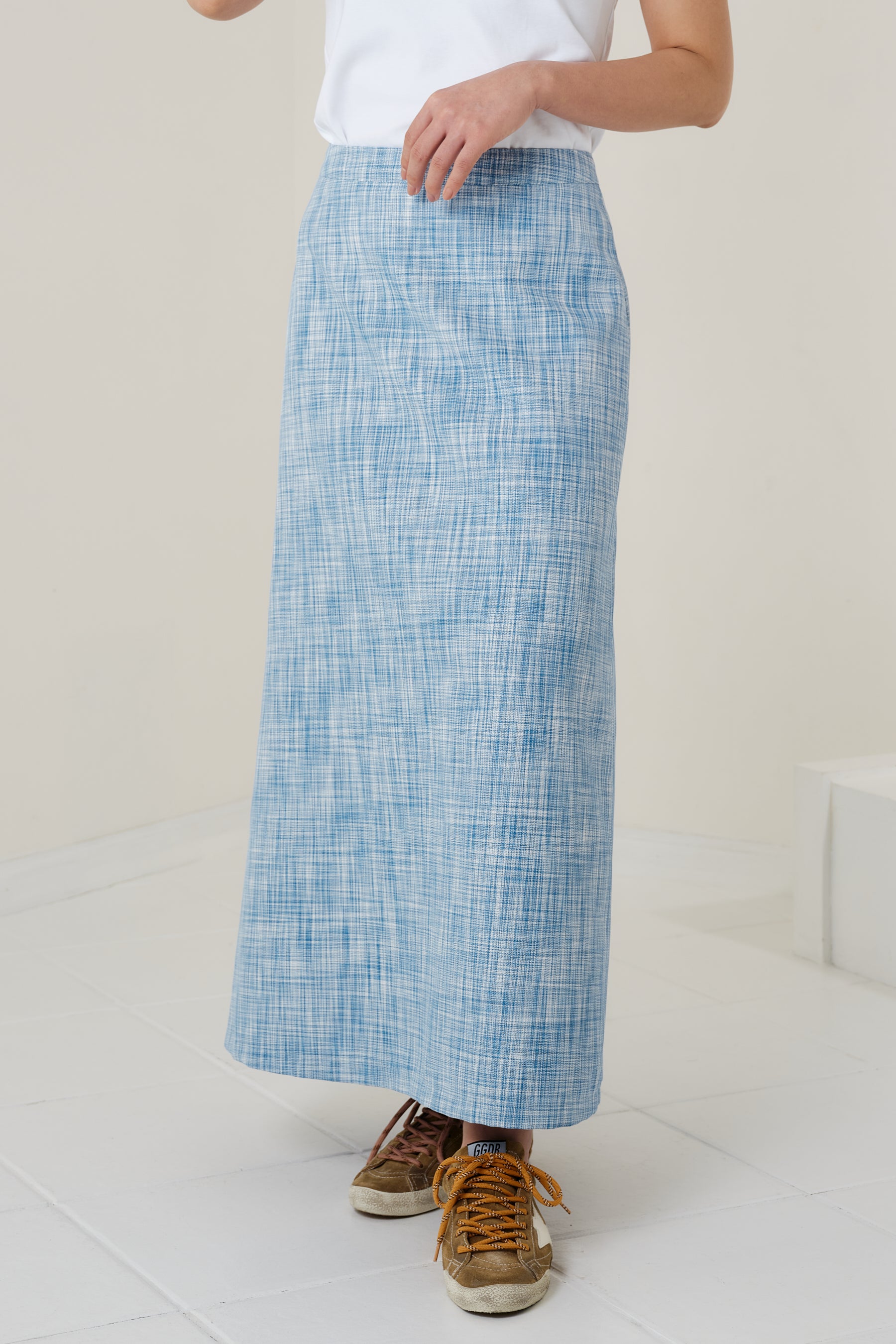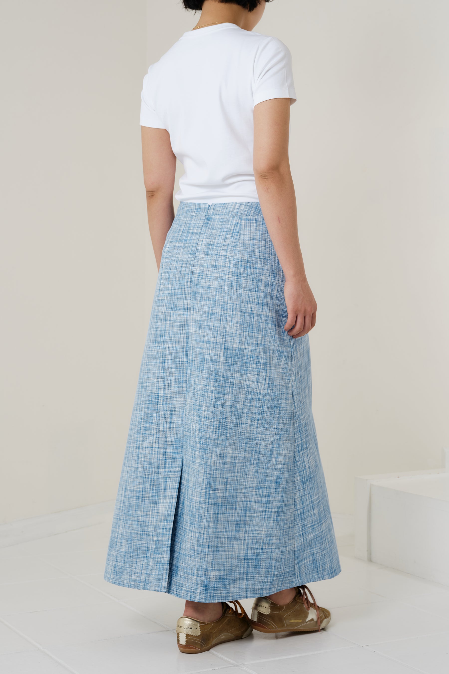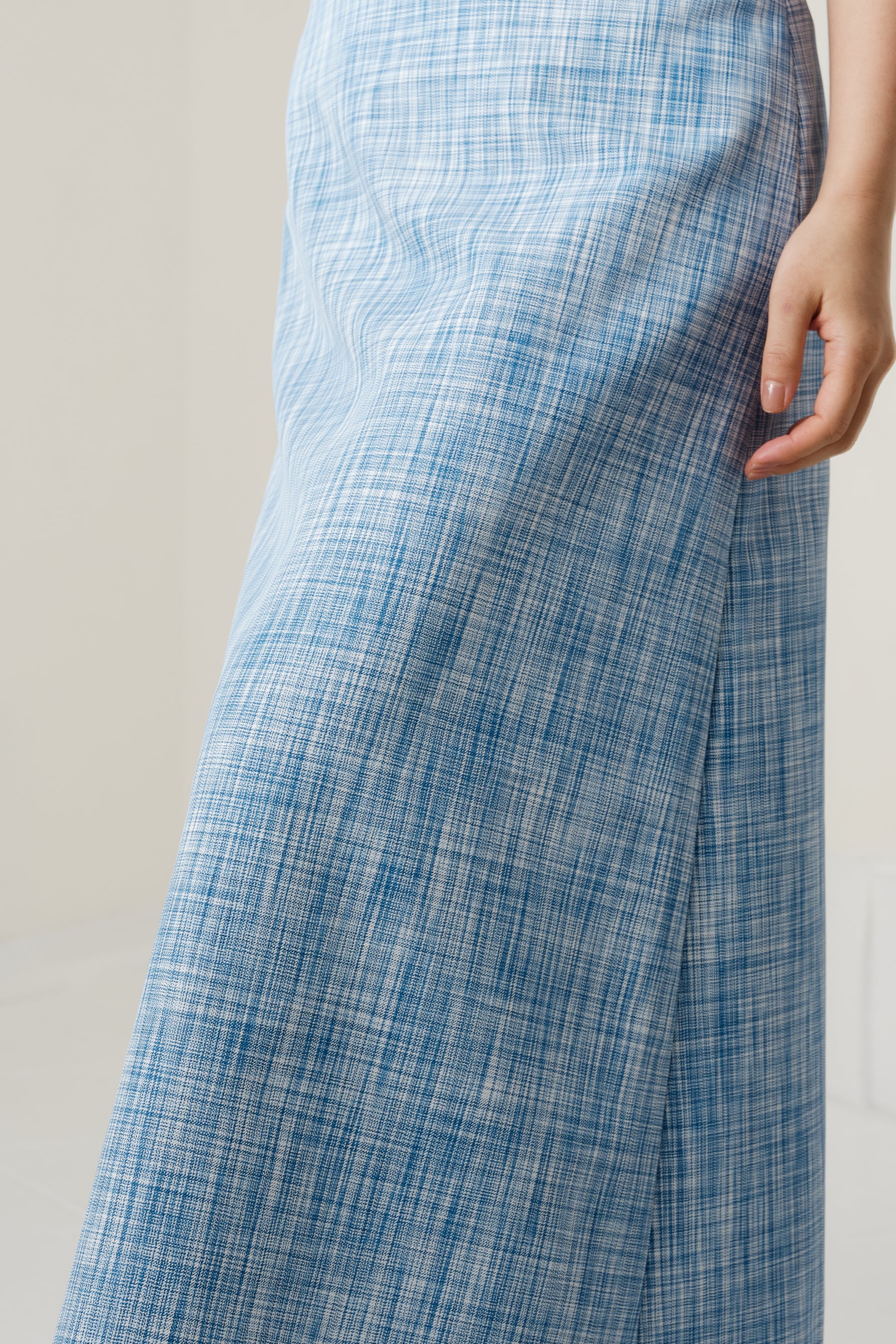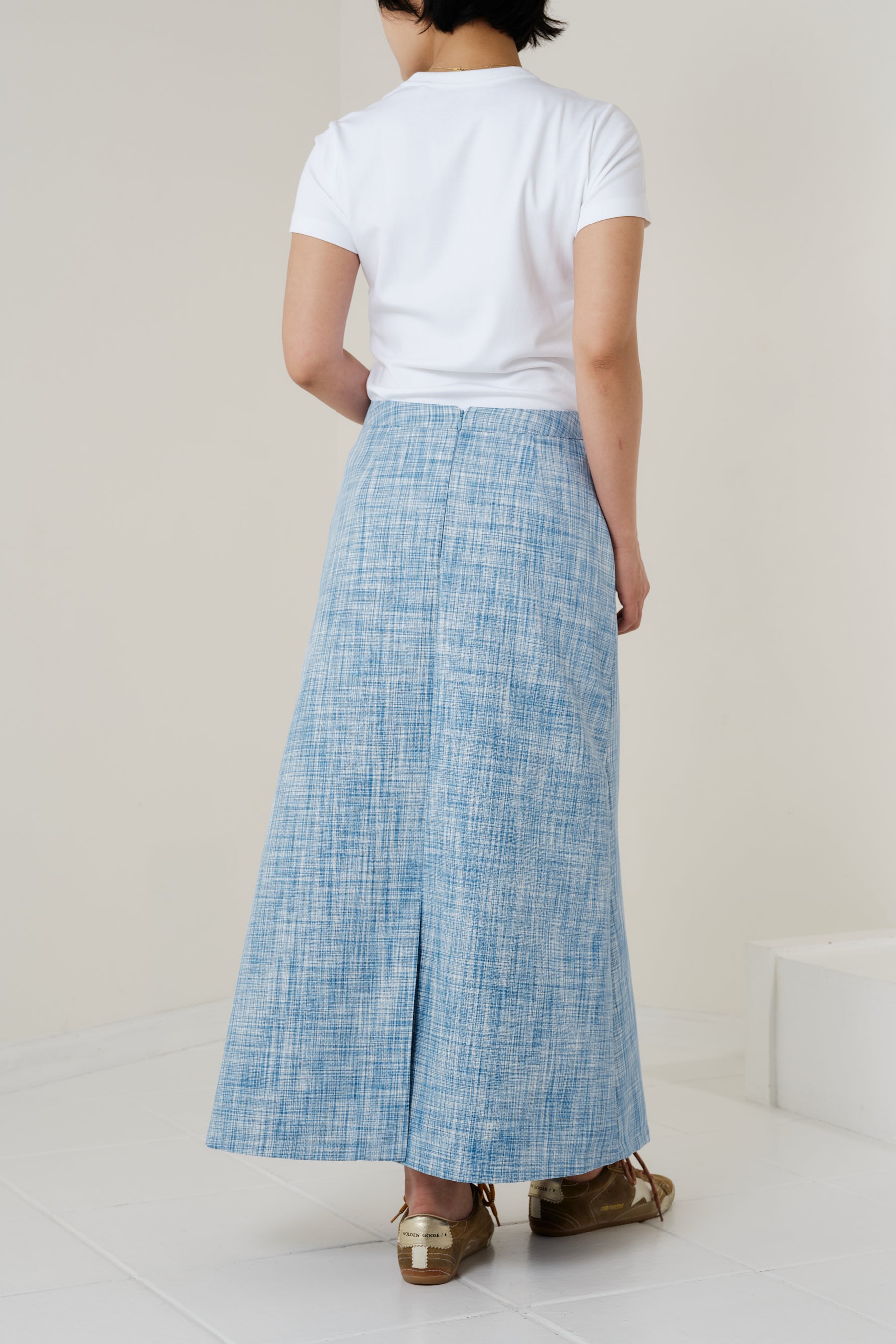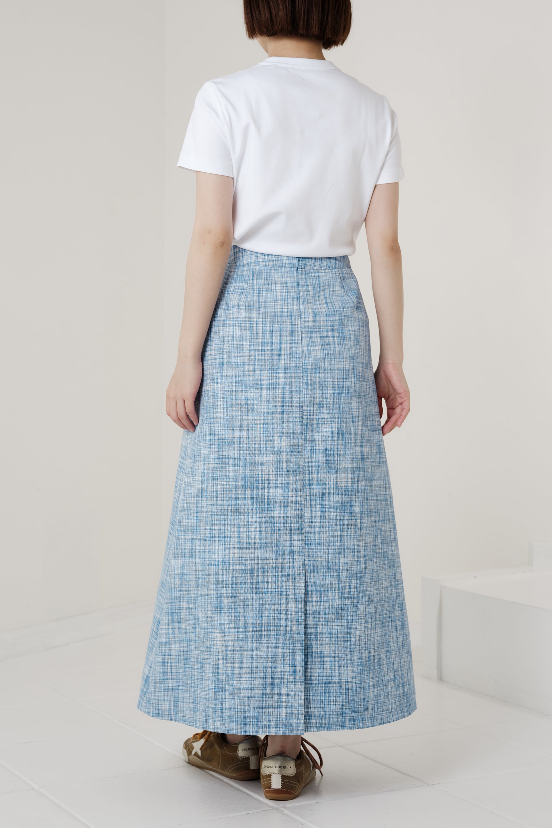 ウエスト周りはすっきりとした設計にし、裾に向かって穏やかに広がる控えめなフレアシルエットに。