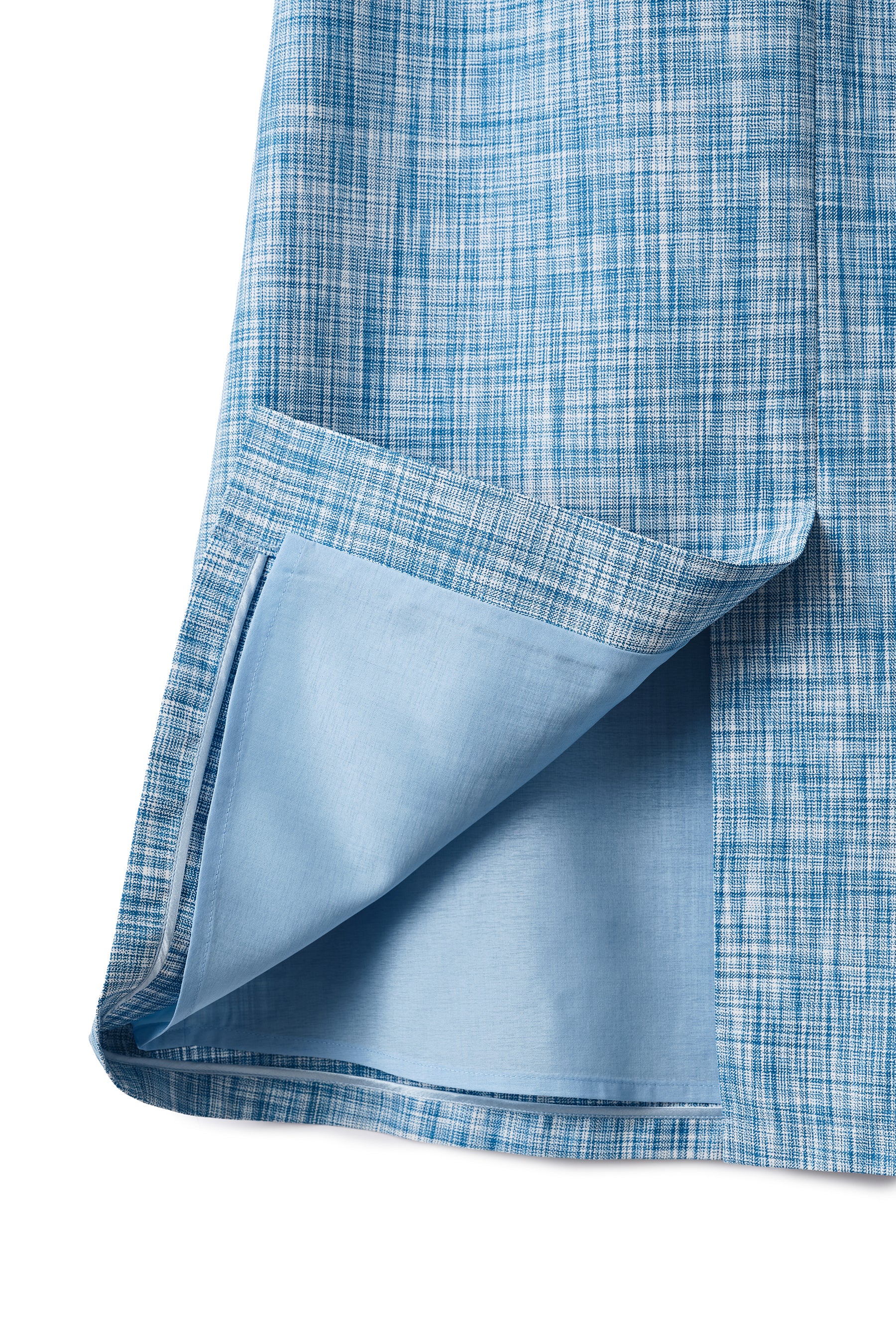 生地には、軽やかなイタリア産のブルーチェック素材を使用。爽やかな色合いと軽やかな素材感が、春夏のスタイリングに涼やかな印象を添えます。