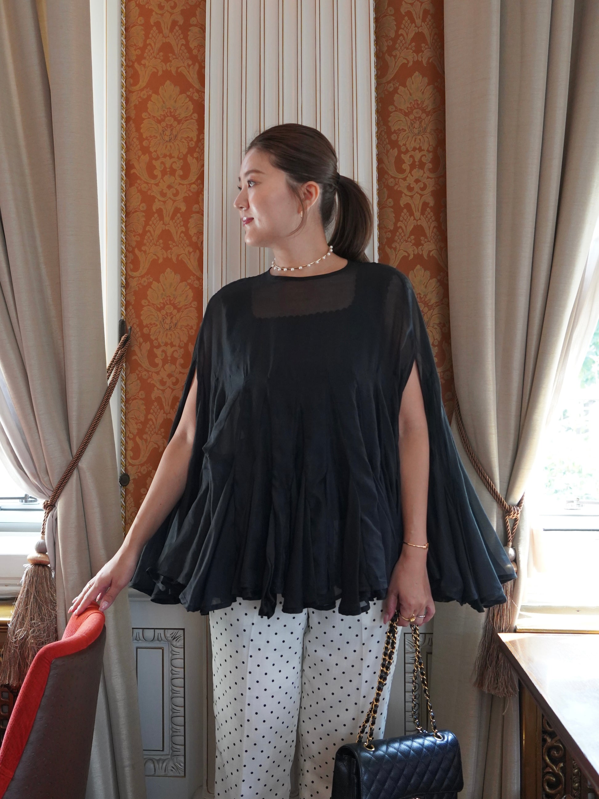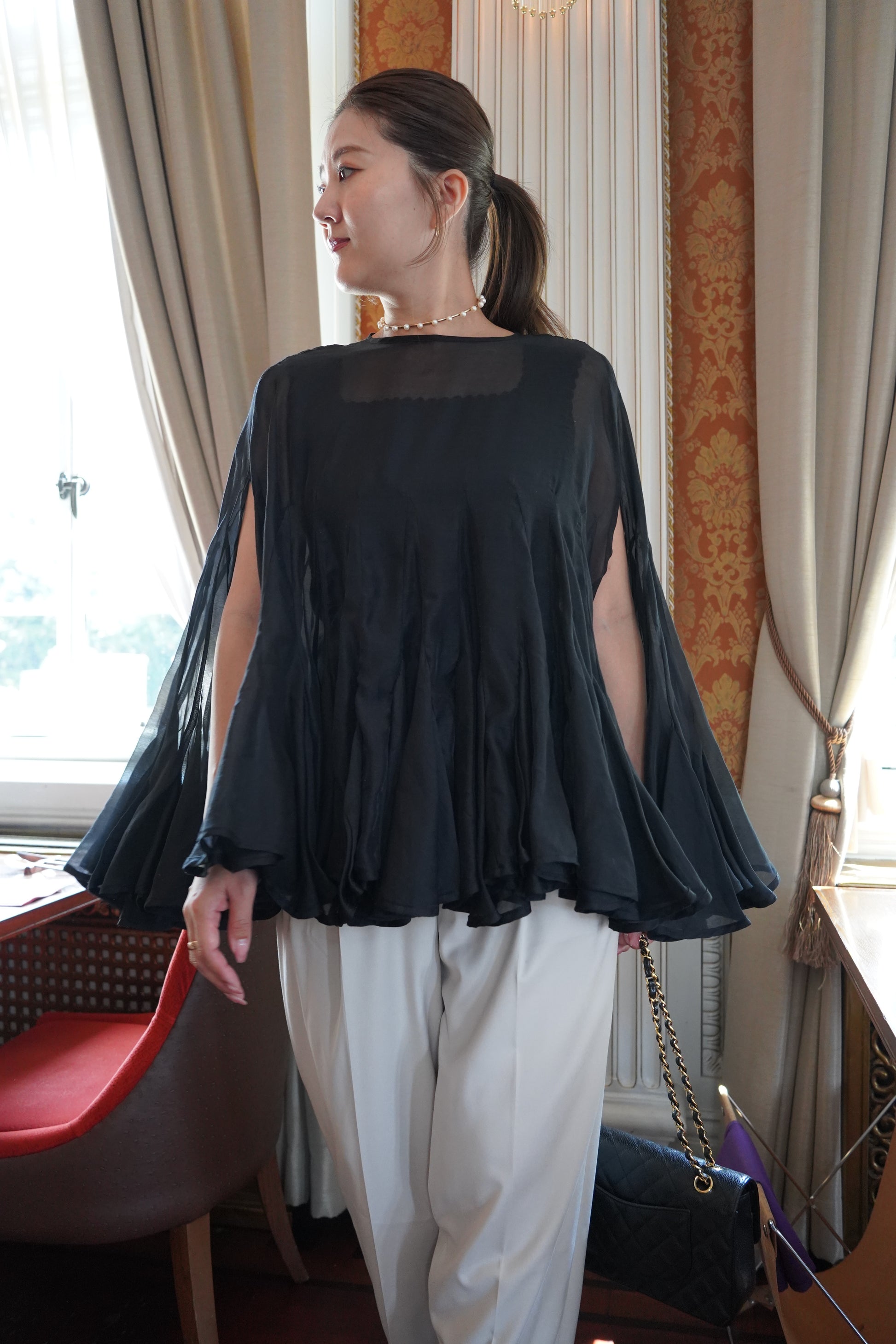 1着あたり7mの生地分量を使い、クラゲのようにふわふわと軽やかに深海を泳ぐ様を表現。特徴的な切り替えを複数入れることにより、静止時はスッキリと見え、動く際には静止時からは想像し得なかった、驚くほどの立体的な動きが出るデザイン。イタリア生産。