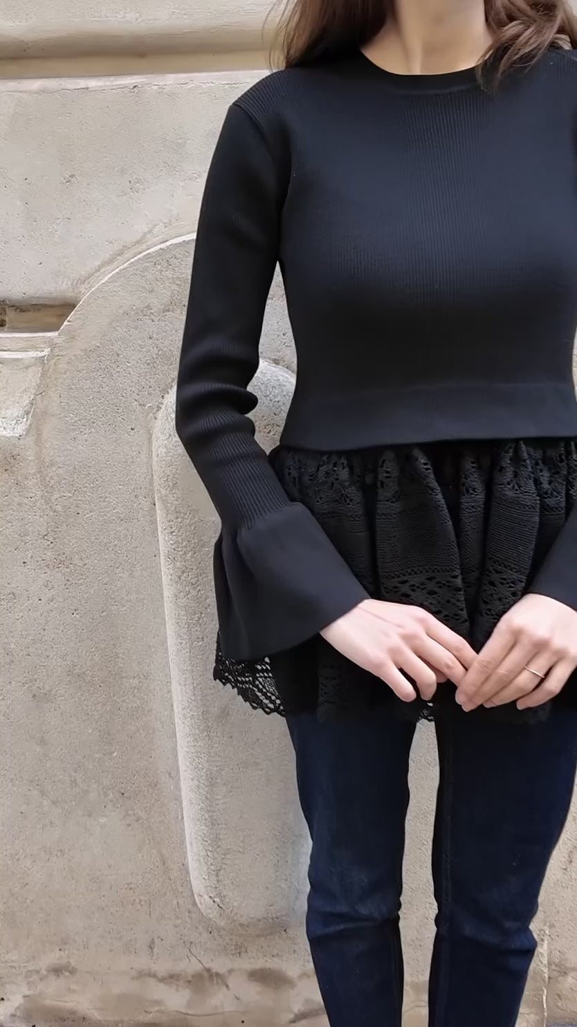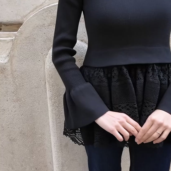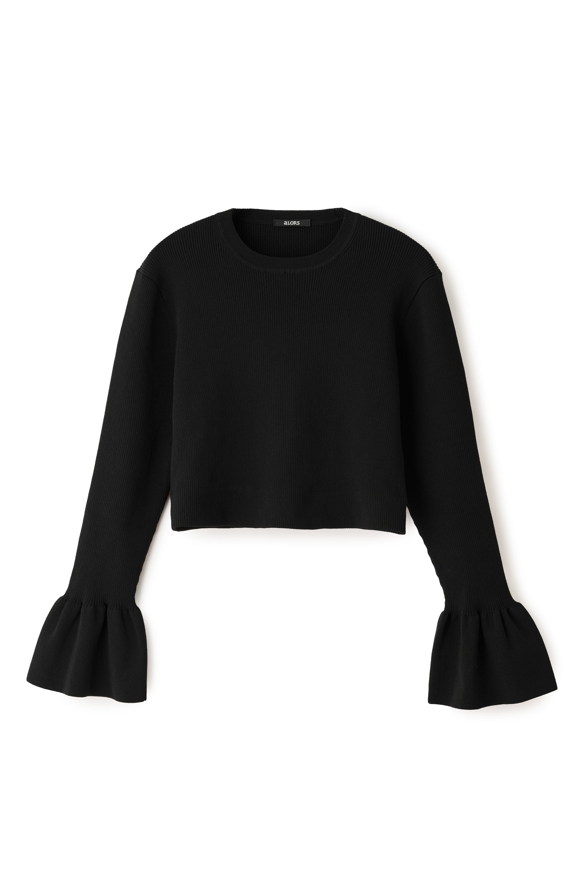 ◼︎デザイン:ベルスリーブとペプラムシルエットが織りなす、女性らしいフォルム。程よい厚みのリブ地がボディラインを美しく引き立てます。冬から春までご着用いただけます。