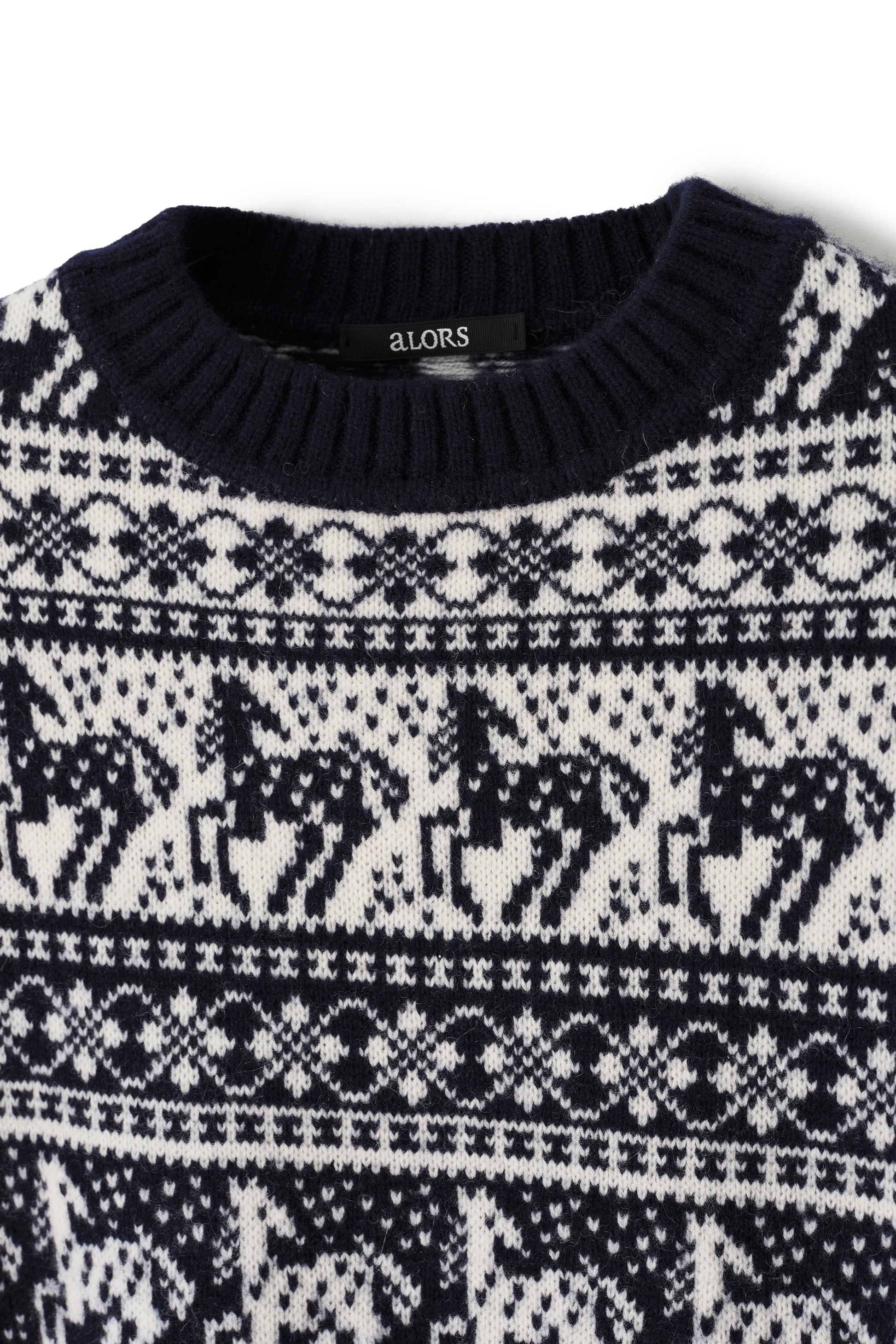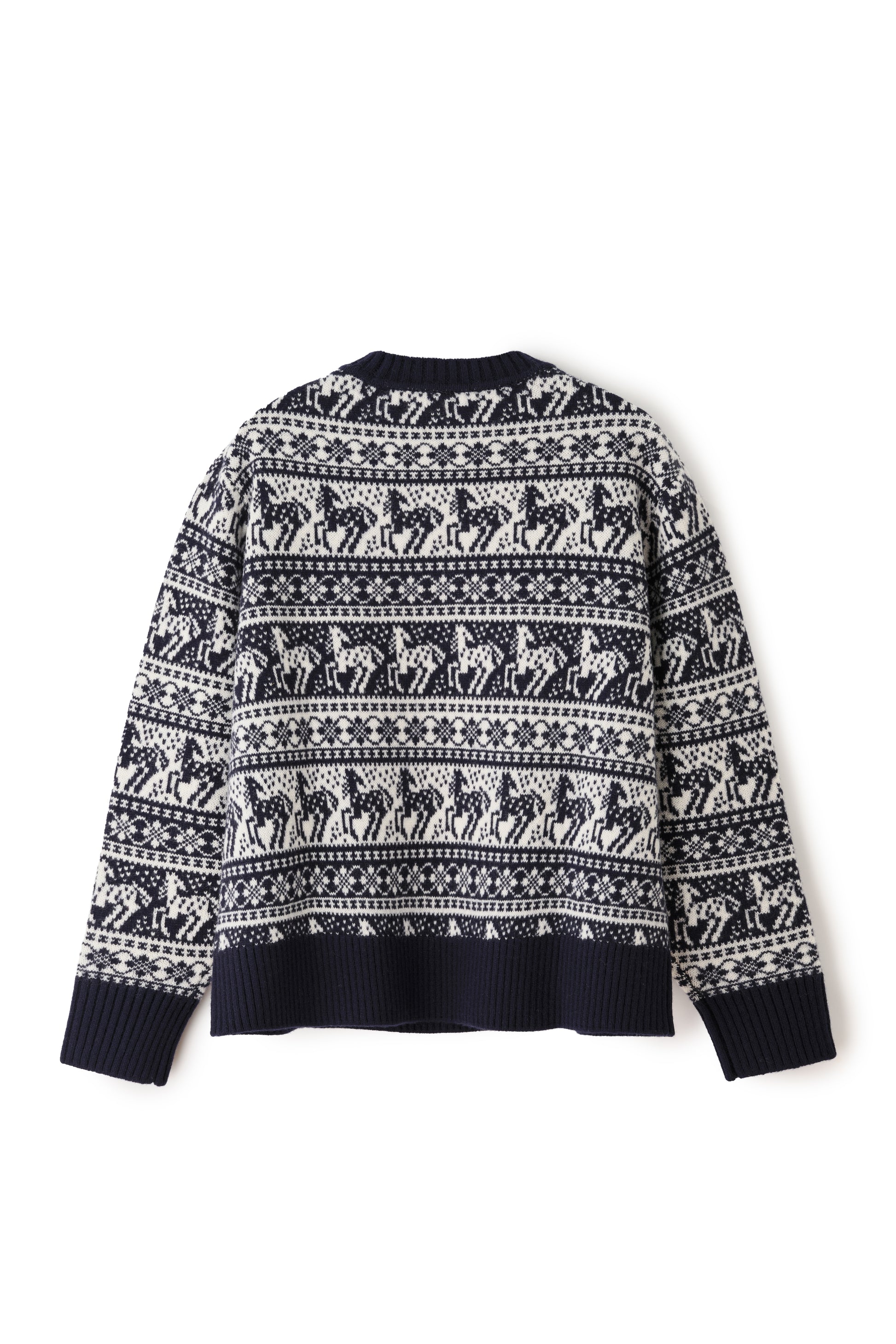 ◼︎デザイン:ノルディック柄に馬モチーフを組み合わせたオリジナルパターン。程よくゆとりのあるシルエットで、クラシカルでありながら印象的な一枚です。