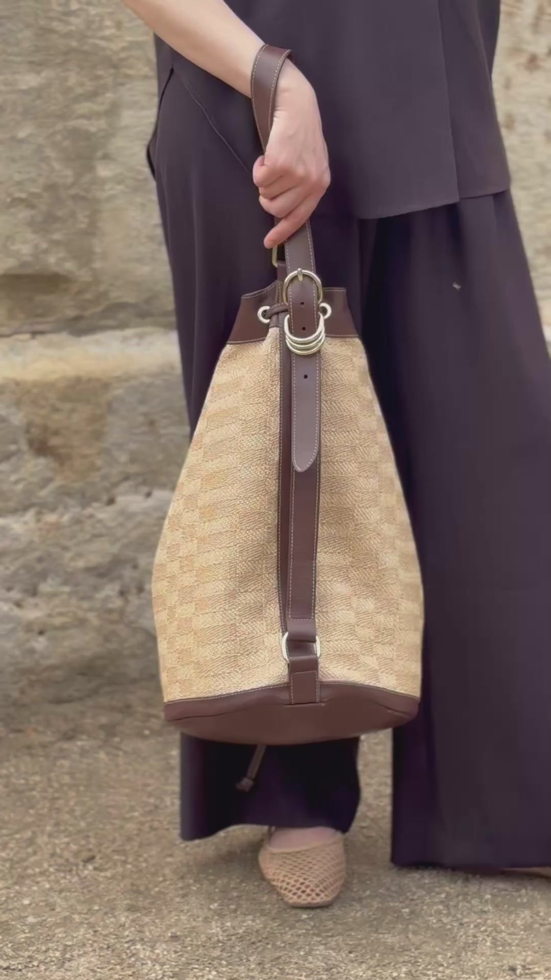 高級素材として知られるラフィアの風合いを、ポリアミド(ナイロン)の特性を活かして忠実に再現した、イタリア産の機能性ファブリックを使用